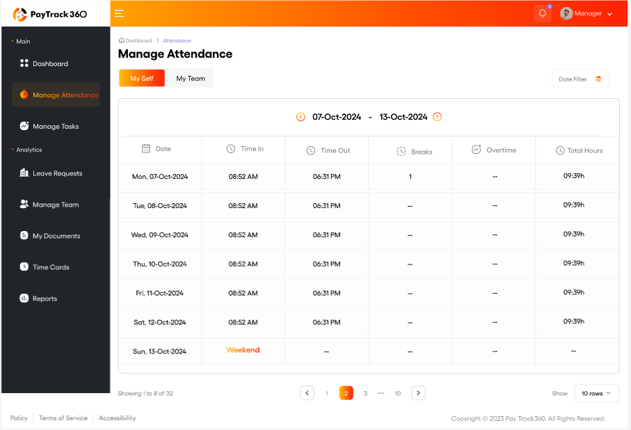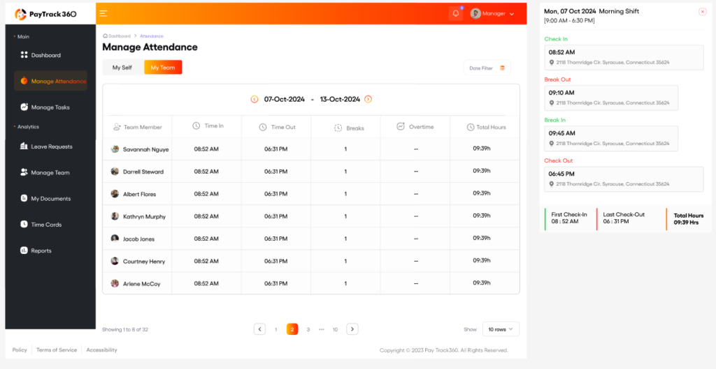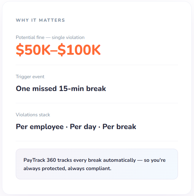 PayTrack 360 automatically monitors every employee's rest and meal periods in real time, flagging any missed window before it becomes a liability.